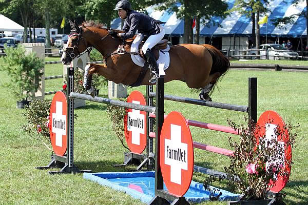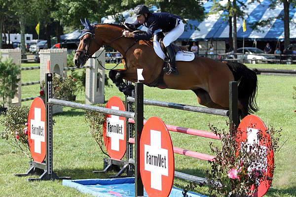 The first round course was one for the books, with only three riders navigating the 16 efforts to find their spot in the jump-off. Philip J De Vita of Apopka, FL, designed the course for the $50,000 Fieldstone Grand Prix, promising an eventful track for the horse and rider combinations. The course featured an opening triple bar, several double combinations, and bending lines. De Vita asked many questions of the riders, setting obstacles set atop the bank and table on the side of the field, as well as placing a tall vertical inside the grob. One of the challenges on the course was to complete a series of three elements representing the pride of Boston, their prestigious sports teams. An entire combination was made of a Boston Bruins vertical, A Boston Celtics vertical to a Boston Red Sox oxer. Although there was no true bogey fence, 12 riders found fault at the final oxer-liverpool obstacle.